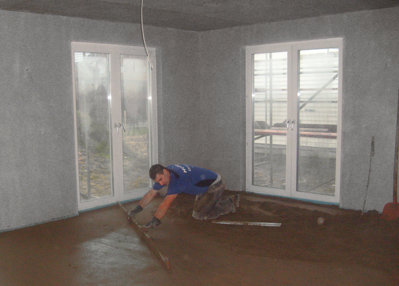Der Estrich mit einer Alulatte planeben abgezogen. Die Verlegung ist auch im Gefälle durch die relativ trockene Konsistenz des Estrichmörtels ohne weiteres möglich.